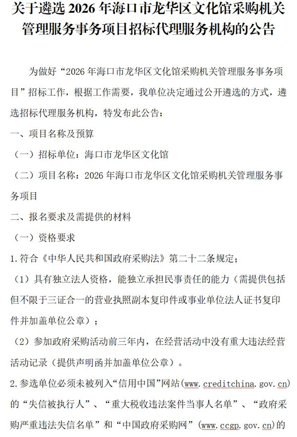 关于遴选2026年海口市龙华区文化馆采购机关管理服务事务项目招标代理服务机构的公告